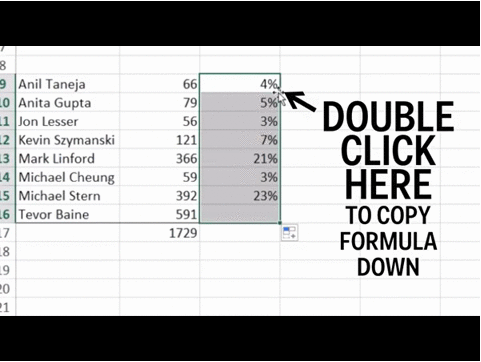 要用函數(shù)自動(dòng)填充同列數(shù)據(jù),不要去長(zhǎng)按鼠標(biāo)然后拼命往下拉到最后一欄——如果你的表格有幾百行呢?雙擊算好單元格的右下小十字,輕松填完整列數(shù)據(jù)。