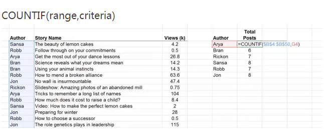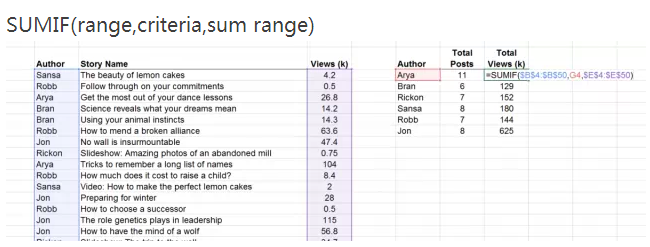 SumIF函數(shù)的用法是根據(jù)指定條件對(duì)若干單元格、區(qū)域或引用求和。下面是我們?cè)谟?jì)算每一個(gè)作者的總體瀏覽數(shù)。范圍上來(lái)說(shuō),作者名字的范圍格式前后并不一致,但總數(shù)相同。B列對(duì)應(yīng)相應(yīng)作者的名字,E列則對(duì)應(yīng)每個(gè)作者作品的瀏覽數(shù)。
