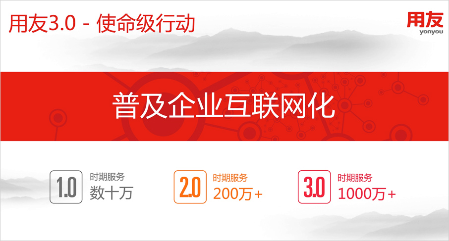 互聯(lián)網(wǎng)化和金融化是當(dāng)代企業(yè)進(jìn)步發(fā)展的重要歷史進(jìn)程。用友的公司使命是“用創(chuàng)想與技術(shù)推動商業(yè)和社會進(jìn)步”。用友已經(jīng)在全體員工中啟 動了一個使命的戰(zhàn)略行動:普及企業(yè)互聯(lián)網(wǎng)化。用友在1.0時期,普及了數(shù)十萬個企業(yè)和組織的電算化。2.0時期在超過200萬家企業(yè)中普及ERP應(yīng)用。用友計劃在3.0時期,把企業(yè)互聯(lián)網(wǎng)服務(wù)普及到1000萬家以上的企業(yè)和組織。