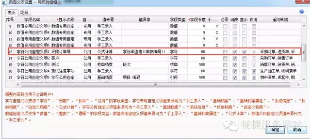 在系統(tǒng)管理-單據(jù)設(shè)置-單據(jù)設(shè)計-采購訂單-自定義項設(shè)置-字符公用自定義項,值來源選擇公式計算,具體值選擇單據(jù)編號,適用單據(jù)選擇采購訂單,進貨單,采購發(fā)票,這樣在具體單據(jù)上把這個自定義項顯示出來,便可以把采購訂單號帶到采購發(fā)票上了。